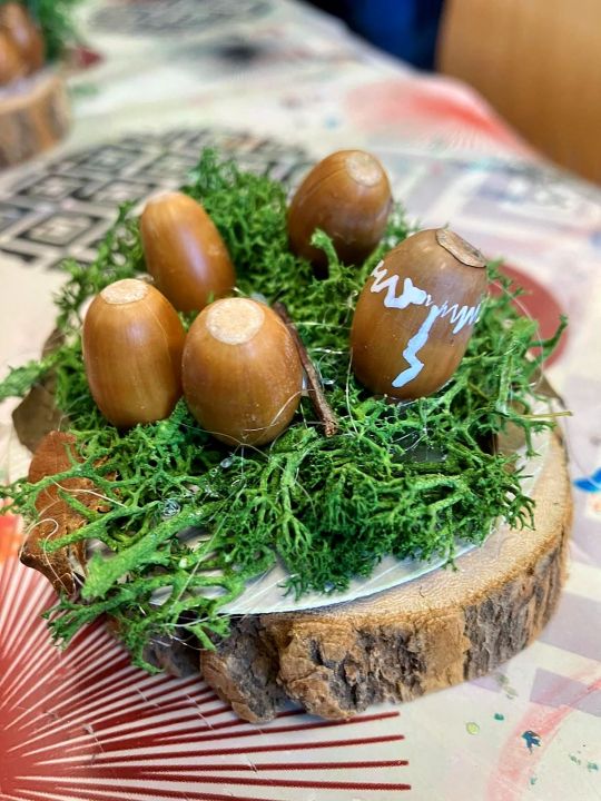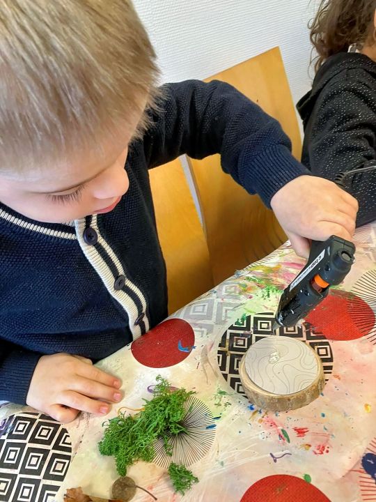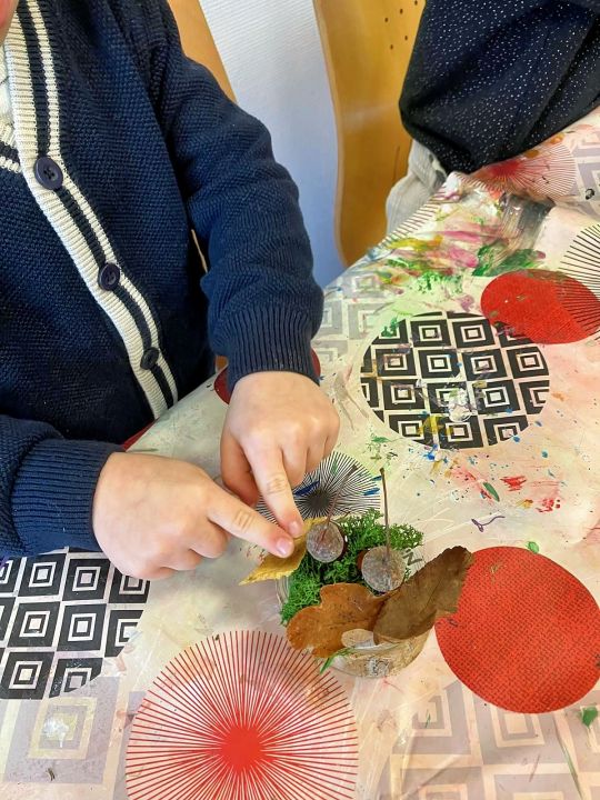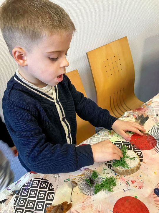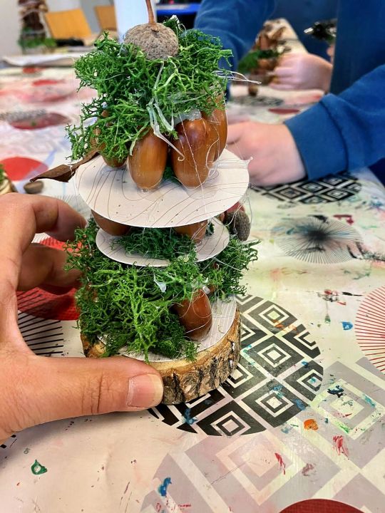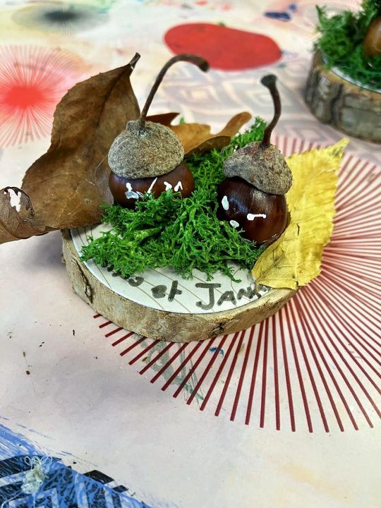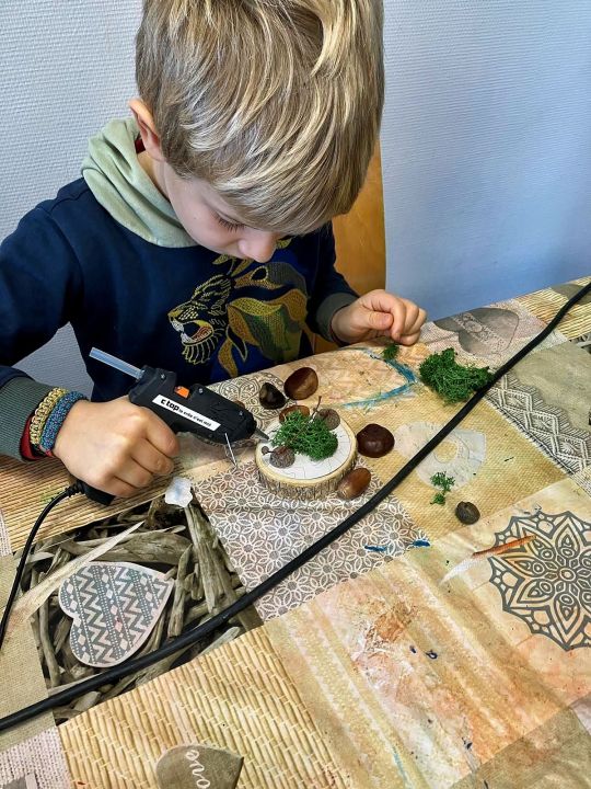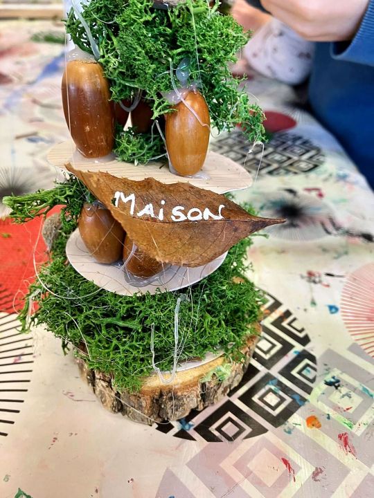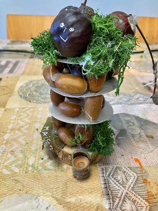 Place à l’imagination ! À l’aide de feuilles, de mousse, de marrons, de glands, de cupules (petits chapeaux sur les glands), les enfants devaient créer une histoire sur un petit rondin de bois !